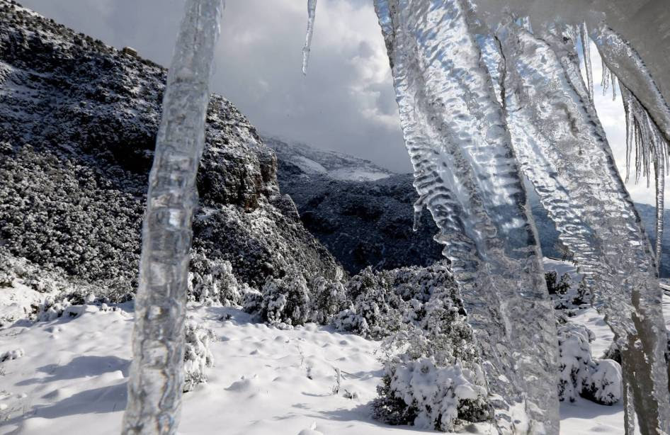 Es menggantung di batu lembah Kristen suci Qozhaya di pegunungan Lebanon, utara Beirut, dua hari setelah badai salju menghantam wilayah tersebut, 9 Januari 2015.